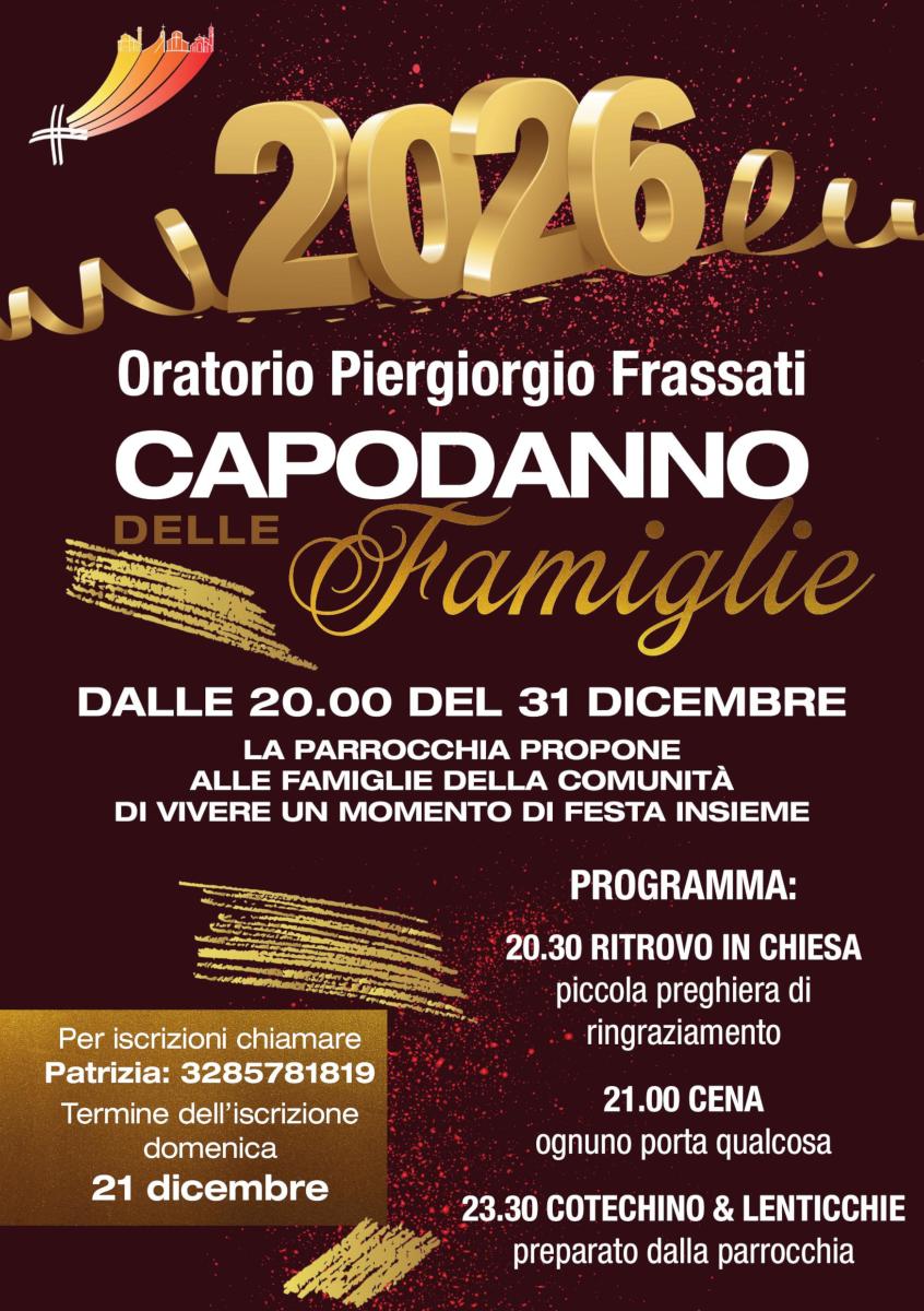 ★ CAPODANNO DELLE FAMIGLIE: mercoledì 31 dicembre – 20:30 Preghiera di ringraziamento in chiesa; 21:00 Cena in condivisione; 23:30 cotechino e lenticchie (vedi retro). Iscrizioni 3285781819 entro il 21/12.